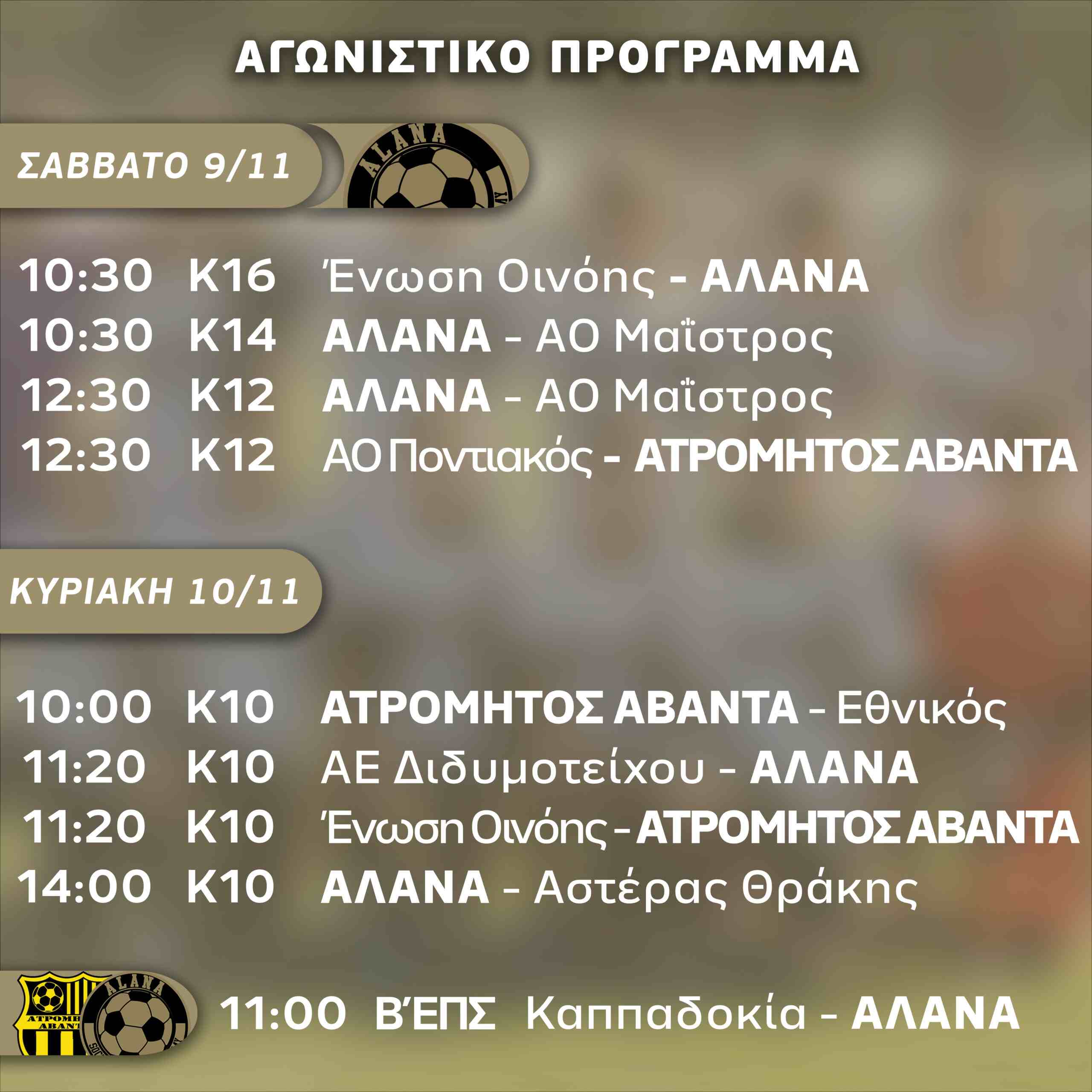 ΑΛΑΝΑ: Το αναλυτικό πρόγραμμα των αγώνων του Σαββατοκύριακου (9-10/11)
